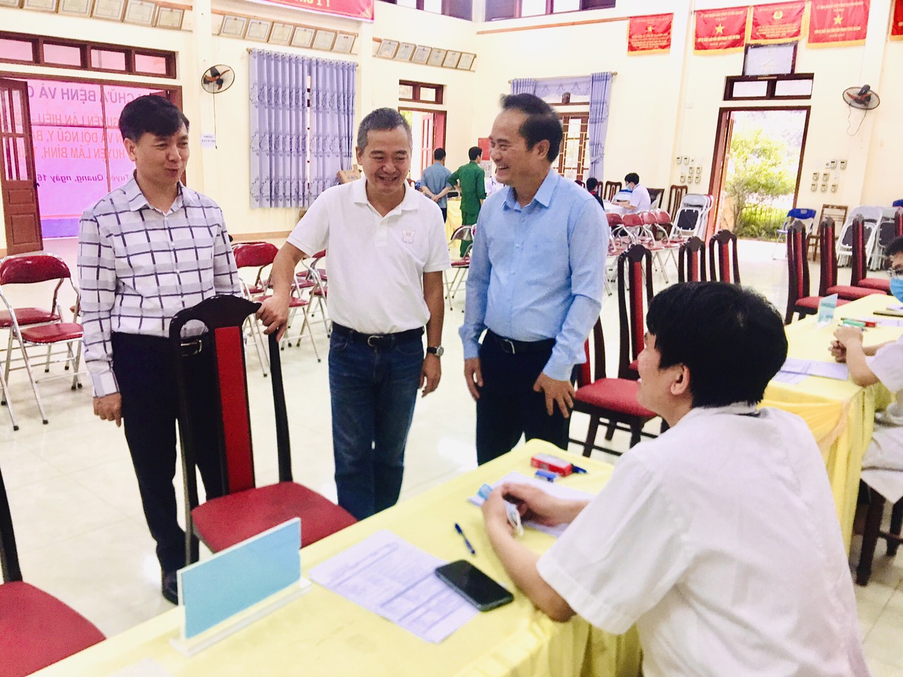 Đồng chí Hoàng Việt Phương, Uỷ viên BCH Đảng bộ tỉnh, Phó Chủ tịch UBND tỉnh; PGS.TS Nguyễn Lân Hiếu, đại biểu Quốc hội khóa XV, Giám đốc Bệnh viện Đại học Y Hà Nội; BSCKII. Nguyễn Thành Hưng, Giám đốc Sở Y tế kiểm tra công tác chuẩn bị khám, cấp thuốc cho nhân dân huyện Lâm Bình.